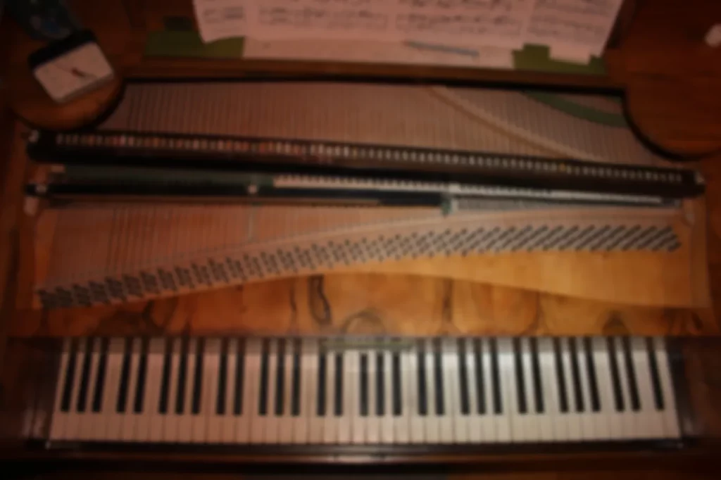 Ce pianoforte possède un très beau placage en noyer qui était teinté, à l’origine, en rouge foncé, pour imiter l’acajou très chic à l’époque. Cette teinte a été retirée au moment de la restauration de 1977. C’est à cette occasion qu’il hérite de cordes en acier, ainsi que de chevilles un peu plus larges.