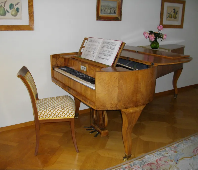En 1815/20 Benignus Seidner de Vienne, construit cet instrument entièrement en bois comme le veut l’héritage historique. Les marteaux recouverts de cuir, touchent des cordes déjà un peu plus épaisses que celles des pianoforte du 18ième siècle. L’étendue du clavier est de Fa 1 à Sol 4. Il possède quatre pédales de droite à gauche :